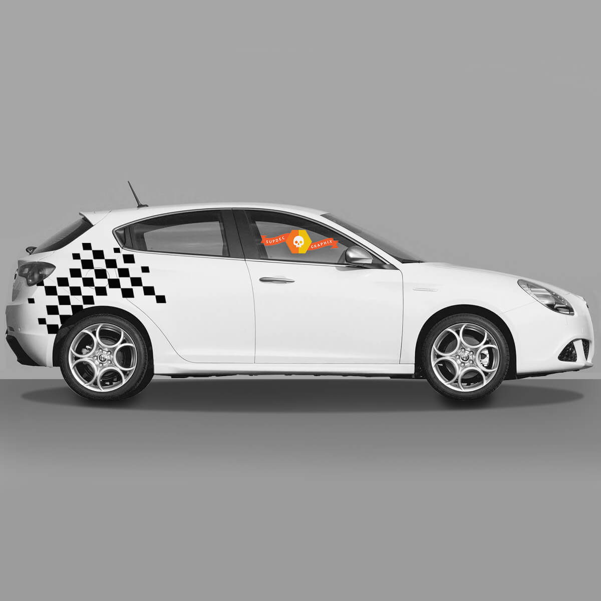 Unique vinyl sticker for Alfa Romeo Giulietta. Stunning vinyl checkered flag decal designed specifically for the rear fenders of an Alfa Romeo.