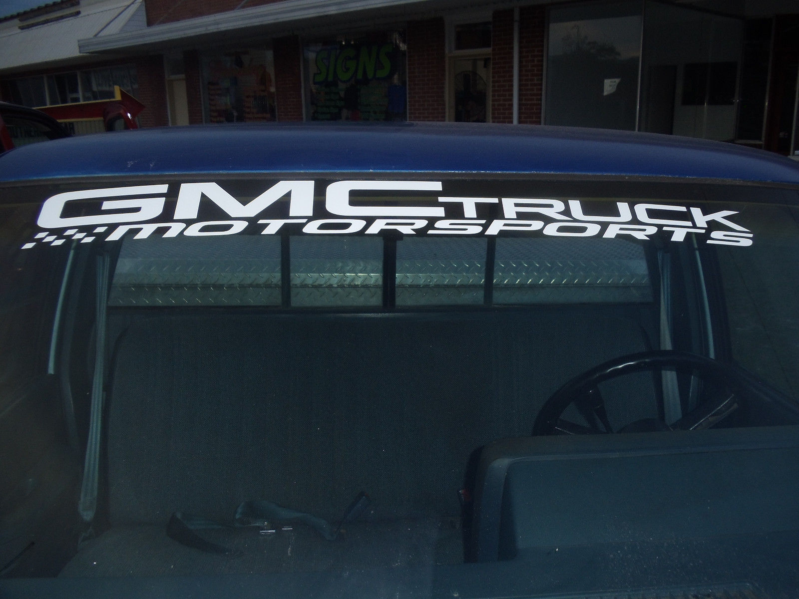 GMC Motorsports windshield topper decal in white. Also, look at my bedside + hood decals and other items. Size is 4" X38" inches. Many other colors upon request. Looks great of any GMC 1500, 2500HD, 3500 or Topkick 4500, 5500 Duramax Diesel truck.