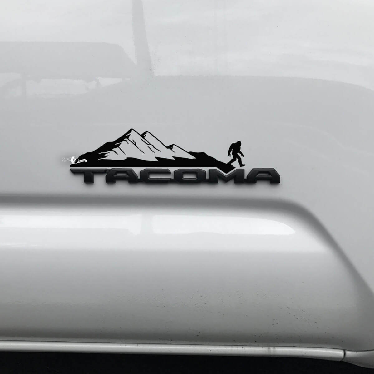 Give your Toyota Tacoma a unique and rugged look with this Mountain Yeti Sasquatch Bigfoot Decal Sticker, designed to overlay your existing badge for a bold, custom appearance. Featuring a detailed Bigfoot and mountain graphic, this vinyl decal adds a touch of mystery and adventure to your truck. Made from premium, weather-resistant vinyl, this decal is built to last, ensuring your Tacoma looks sharp on all your off-road adventures. The easy peel-and-stick application allows for seamless installation over your badge, giving your truck a personalized, off-road-ready aesthetic.