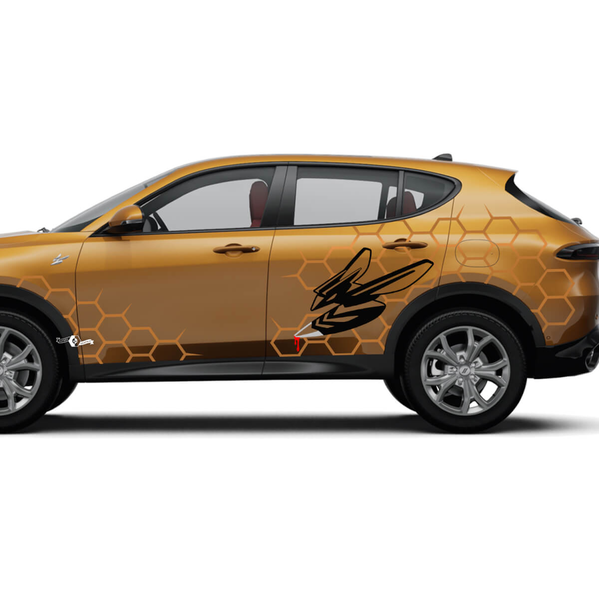 Hendesa lako Dodge Hornet kun this pair of Side Splash Wrap Honeycomb Vinyl Decals. Diseñado para cubrir la puerta y área del guardabarros, estos calcomanías presentan un audaz patrón de panal que agrega una apariencia dinámica, inspirada en el rendimiento a tu SUV compacto.