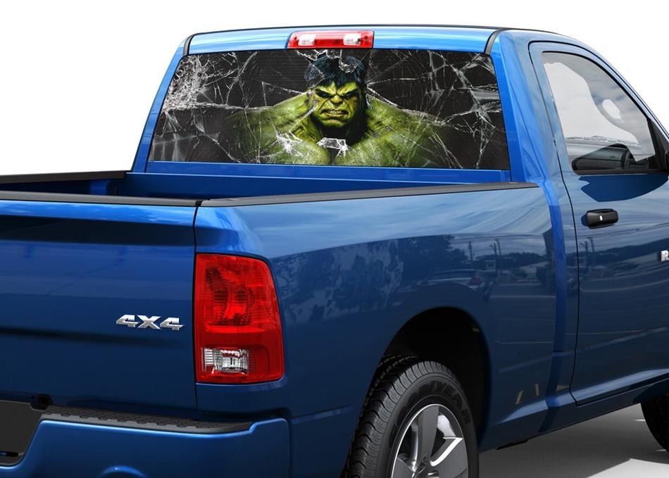 Hulk and broken glass Rear Window Decal Sticker Pick-up Truck SUV 2 Please make sure that this size will suit your truck. This will be applied to the outside of your window.