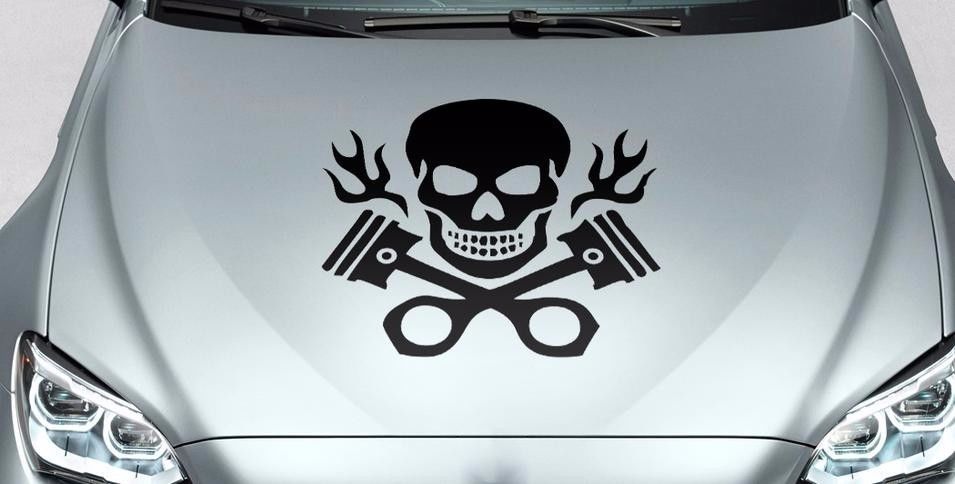 Skull and crossed pistons with flames hood body logo vinyl Stickers Decals
