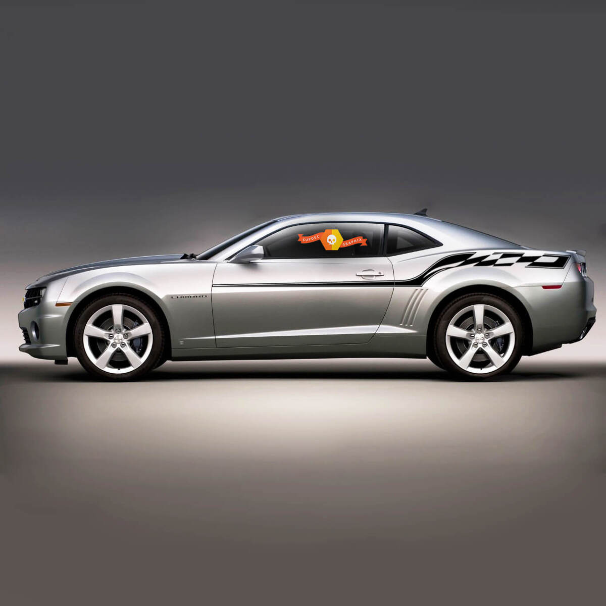 The stickers are long stripes with a wide tipped end on the rear fenders, it looks in a racing style with a Chevrolet Camaro car.