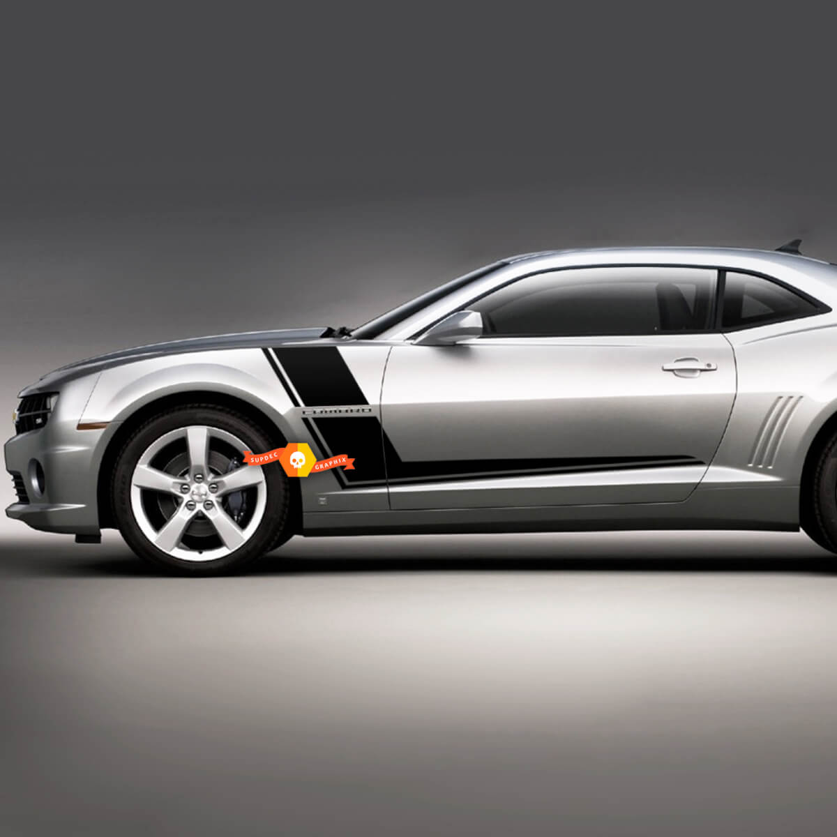 A sticker with customized text and color for your Chevrolet Camaro is the perfect way to add personality and style to your car. This sticker includes side hockey stripes and Camaro text (you can change the text) that will give your car a dynamic and sporty look.