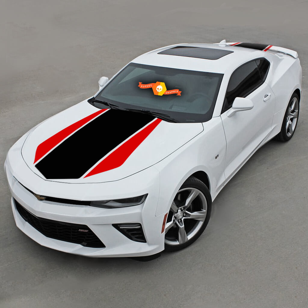 Two-tone sports stripes for Chevrolet Camaro 2016-2020 (RS, LT) models with two-tone stripes for the hood and rear, you can completely transform the boring exterior of the car. These colored vinyl car strips are designed to decorate your Camaro, giving it a dynamic and modern look.