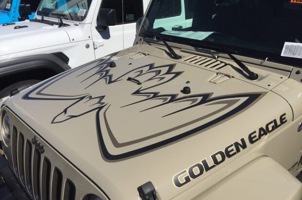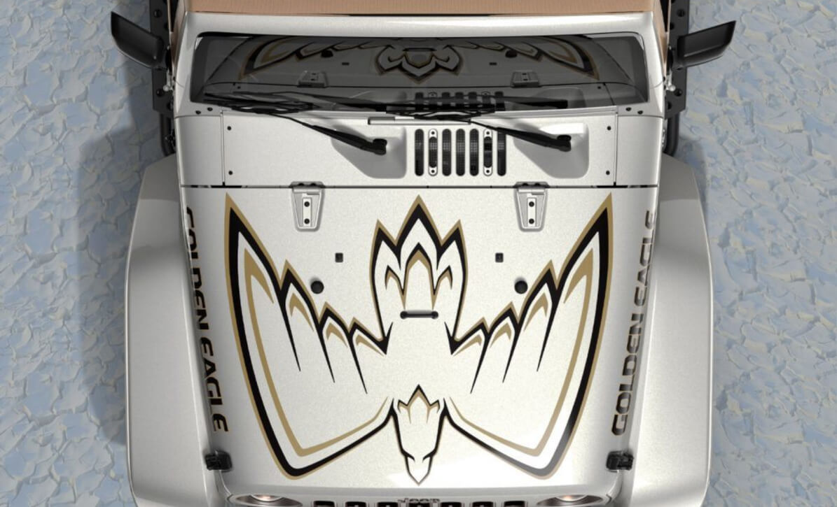 The minimalism of the head. According to statistics, more and more people believe that small, slightly primitive accessories can be a good complement, both to the image of a person and to the appearance of something like a car. You should get acquainted with our latest creation, which produced a real furor - the Jeep Wrangler New Golden Eagle Hood Decal.