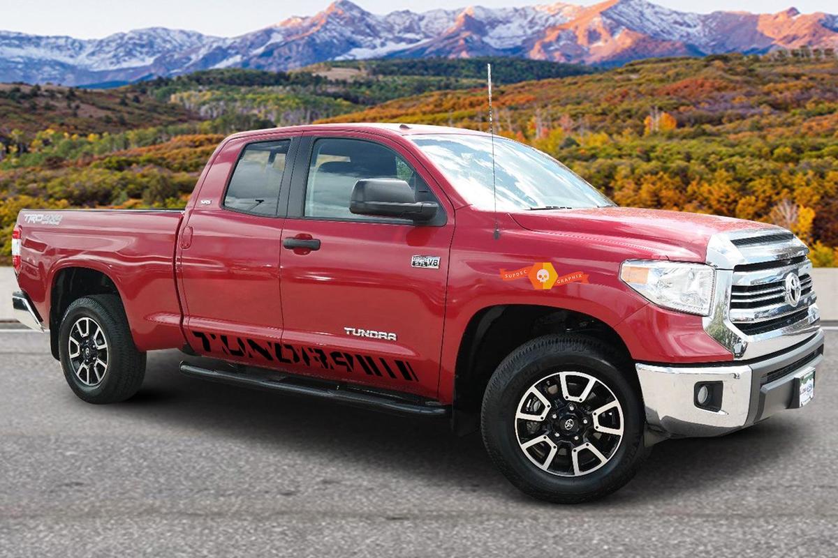 size: Fit to Toyota Tundra; quantity: Set of 2 decals for left & right side; default color: as on the picture; (you can tell us your color in note section) material: High quality Avery vinyl; Others: Waterproof, Removable, TRANSFER APP TAPE WILL BE APPLIED ON THE GRAPHIC FOR AN EASY INSTALLATION PROCESS! Come with instruction